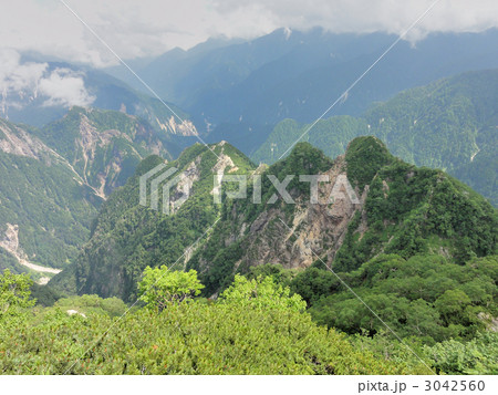 從北阿爾卑斯山的三股蓮華山眺望槍岳和穗高岳的夏季景色