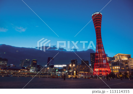 日本,兵庫縣,神無市 - 神無港塔,神無海事博物館,黃昏時分出現的橙色和日本綠色的燈光。