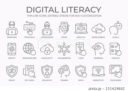 Digital literacy outline icons bundle. Identity, update, cloud safety, skills, video call and more signs. Editable stroke.
