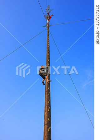 Traditional ladder climbing activity, climbers ascend step by step.