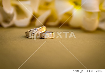 Elegant precious Diamond wedding Rings Resting On Surface With Blurred Backdrop For Wedding ceremony