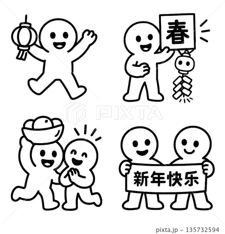 Happy characters celebrating Chinese New Year with lanterns, decorations and banner