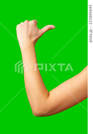 Graphic composition. Strong hand holding recycling bag with eco symbol on blue background