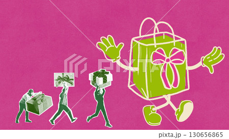 Colorful collage. Walking gift bag with bow and waving hands surrounded by people carrying presents