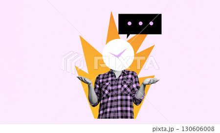 Graphic composition. Woman with computer monitor head surrounded by clouds on blue background