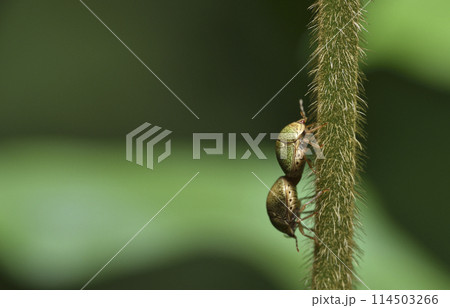 在植物莖爬行交尾的篩豆龜椿特寫
