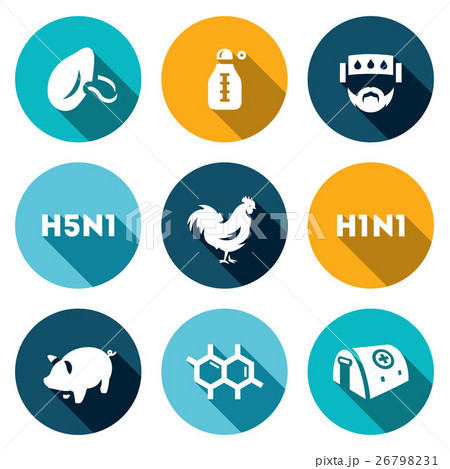 Coronavirus symbol. Pig bird bat flu and other animal influenzas. Comic vector icons, illustration on white background.