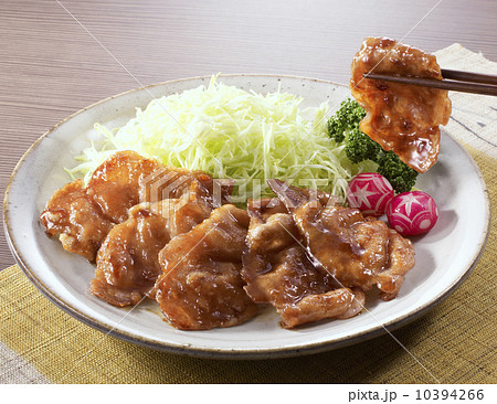 美味的薑烤豬肉和烤豬腰肉。加入切碎的捲心菜。