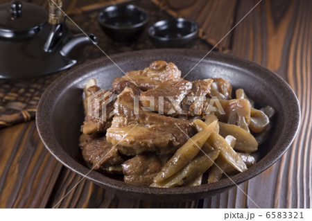 豬肉湯的水彩插圖,配料豐富(包括蘿蔔、胡蘿蔔、豆腐和魔芋)