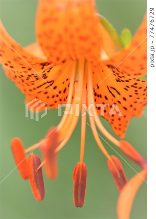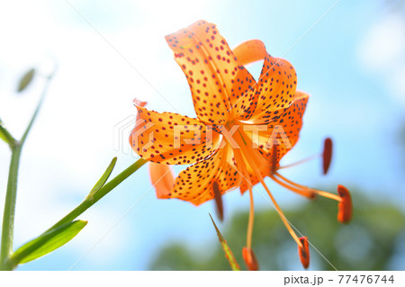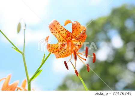 Mejiro花園的Ikeizumi橙色百合花的全景射擊在池塘著陸的六角形的浮動大廳前面開花。