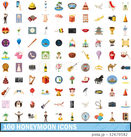 100 honeymoon icons set, cartoon style