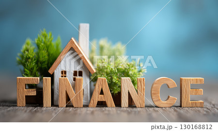 Wooden letters spelling finance with small house and green plants in background, symbolizing home investment and financial growth