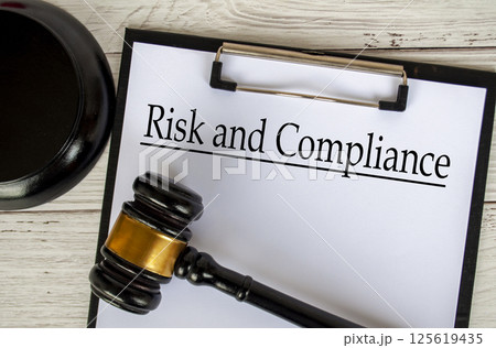 Top view of Risk and Compliance text on clipboard with gavel on top. Code of Conduct concept.