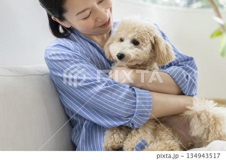中年婦女抱著她的寵物狗