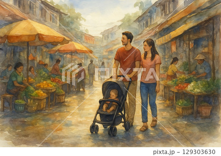居家傳統市集散畫|父親、母親、孩子水彩日常風景