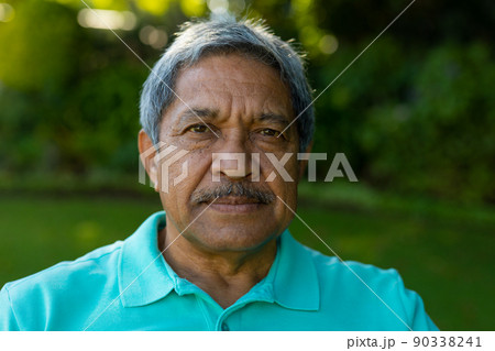 Portrait of smiling biracial senior man wearing blue t-shirt with gray hair standing in park