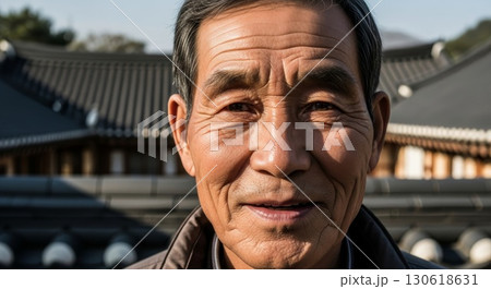 Smiling Senior Asian Man Portrait in Traditional Korean Village