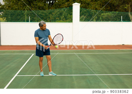 Full length of biracial senior man holding racket and ball playing tennis at tennis court