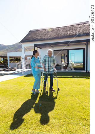 Biracial female doctor assisting smiling caucasian senior man in walking with walker in yard