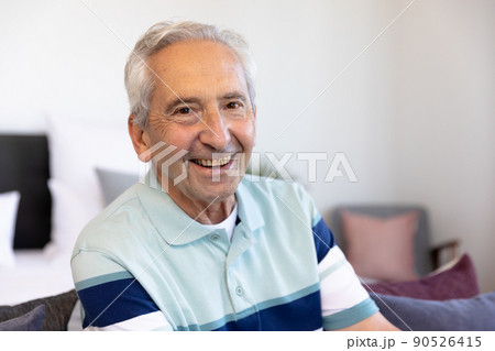 Close-up portrait of cheerful caucasian senior man sitting on sofa against wall in living room