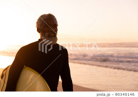 Bearded african american senior man with surfboard standing against sea and clear sky at sunset
