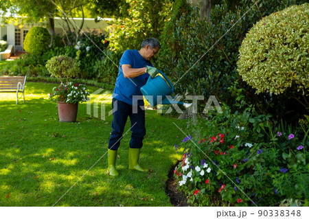 Full length of biracial senior man wearing rubber boots and gloves watering plants with can in yard