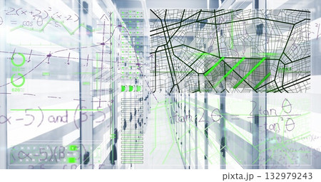 Image of mathematical equations and data processing over server room