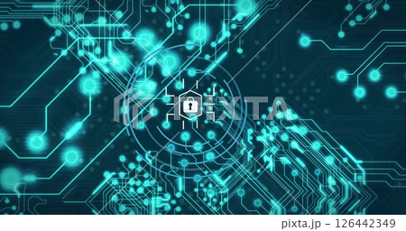 Image of padlock icon, digital data processing over network of connections