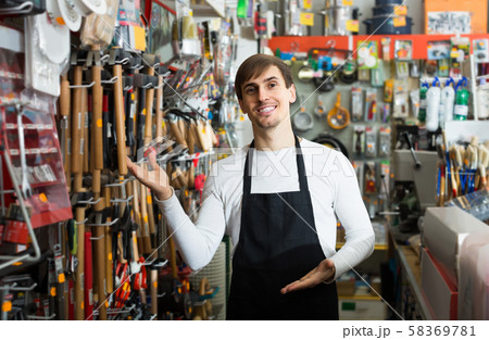 male seller posing at tooling section of household store