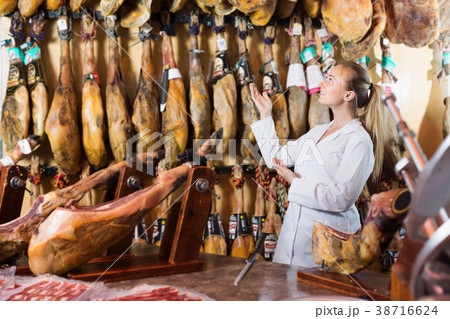 Female seller wearing uniform showing iberian jamon