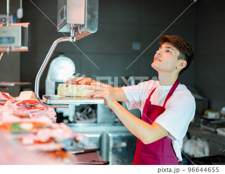 Young salesman weighing cheese on a scale in grocery store