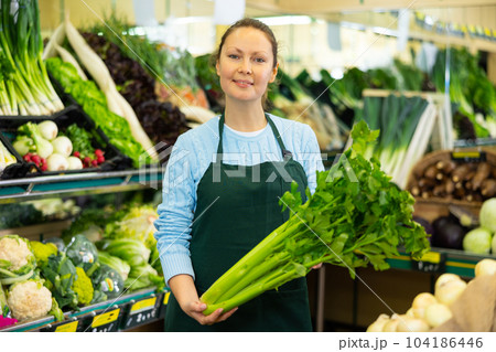 Smiling female merchandiser with celery in hands in grocery supermarket