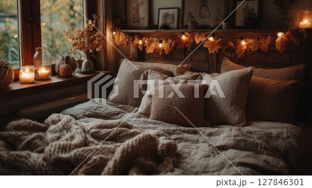 Cozy Autumn Bedroom Interior with Warm Lighting and Textured Blankets