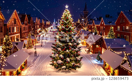 雪夜中聖誕彩燈照亮的城市鳥瞰圖