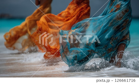 Women in Flowing Dresses on a Tropical Beach