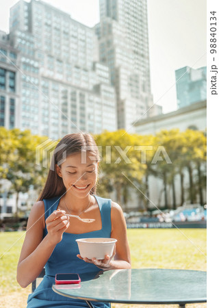 Healthy food Asian woman eating Acai bowl breakfast with spoon at New York City park on morning or lunch break. Businesswoman professional sitting outside at Bryant Park, NYC, summer lifestyle