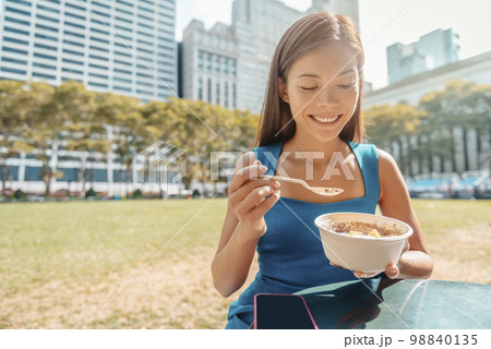 Asian young business woman eating bowl of healthy food with spoon at New York City park during lunch break. Businesswoman professional sitting at Bryant Park in NYC, summer lifestyle