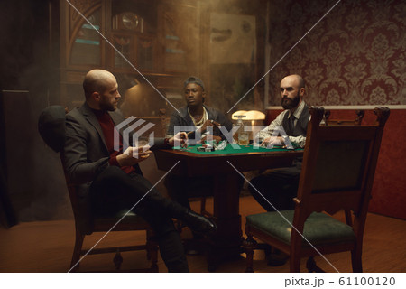 Poker players with cards and chips in casino