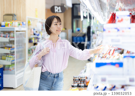 一位女士在藥房/藥店/便利店一邊查看智能手機一邊購買化妝品