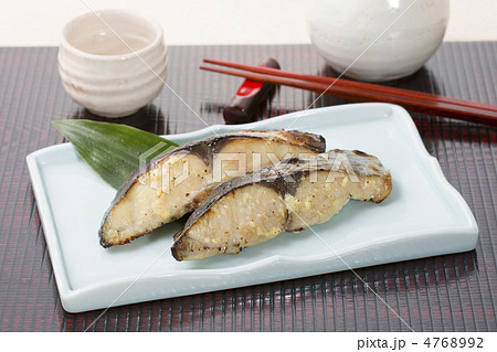 白底肥厚的烤製黑鯛魚西京燒的照片