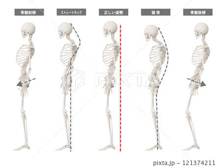 姿勢比較圖 骨骼模型 全身側躺 駝背 直頸 骨盆前傾 後傾