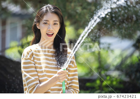 年輕的女人,笑著,花盆