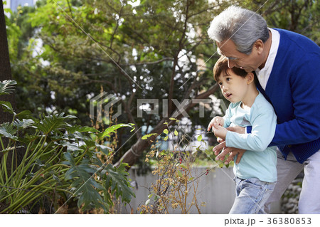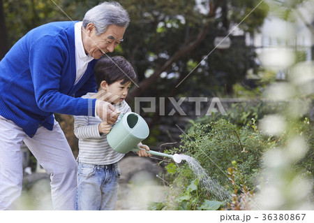 祖父,孫子,澆水