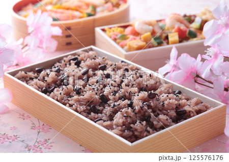 在日本的慶祝活動中,人們會吃紅米飯,照片中紅米飯的粉紅色背景上點綴著櫻花。