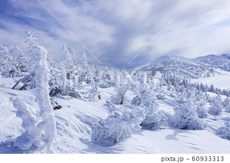 青森縣八甲田山頂公園冬季的青森冷杉和小嶽山、井戶山、赤倉山