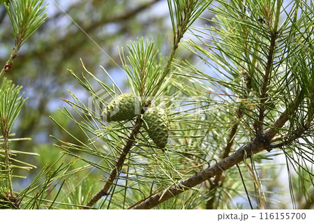 日本赤鬆的枝條上結著球果