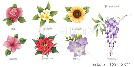 Vector set of floral elements. Wisteria, plumeria, freesia, hibiscus, sunflower, rose on an isolated background.Floral poster, invite. Wedding concept with flowers.