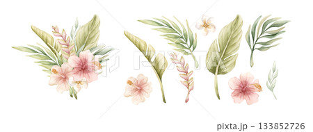 Pink hibiscus, plumeria flowers and tropical leaves watercolor set isolated on white. Floral exotic clipart for botanical designs.