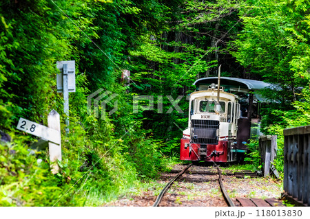長野縣_穿過鮮綠的赤澤自然休養林的森林鐵路無軌電車_2023年5月2日拍攝的照片