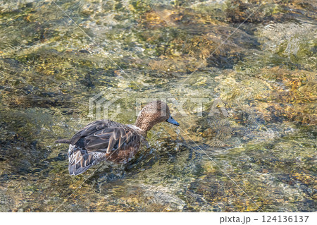 一隻雌性赤頸鴨在京都市鴨川清澈的河水中游泳